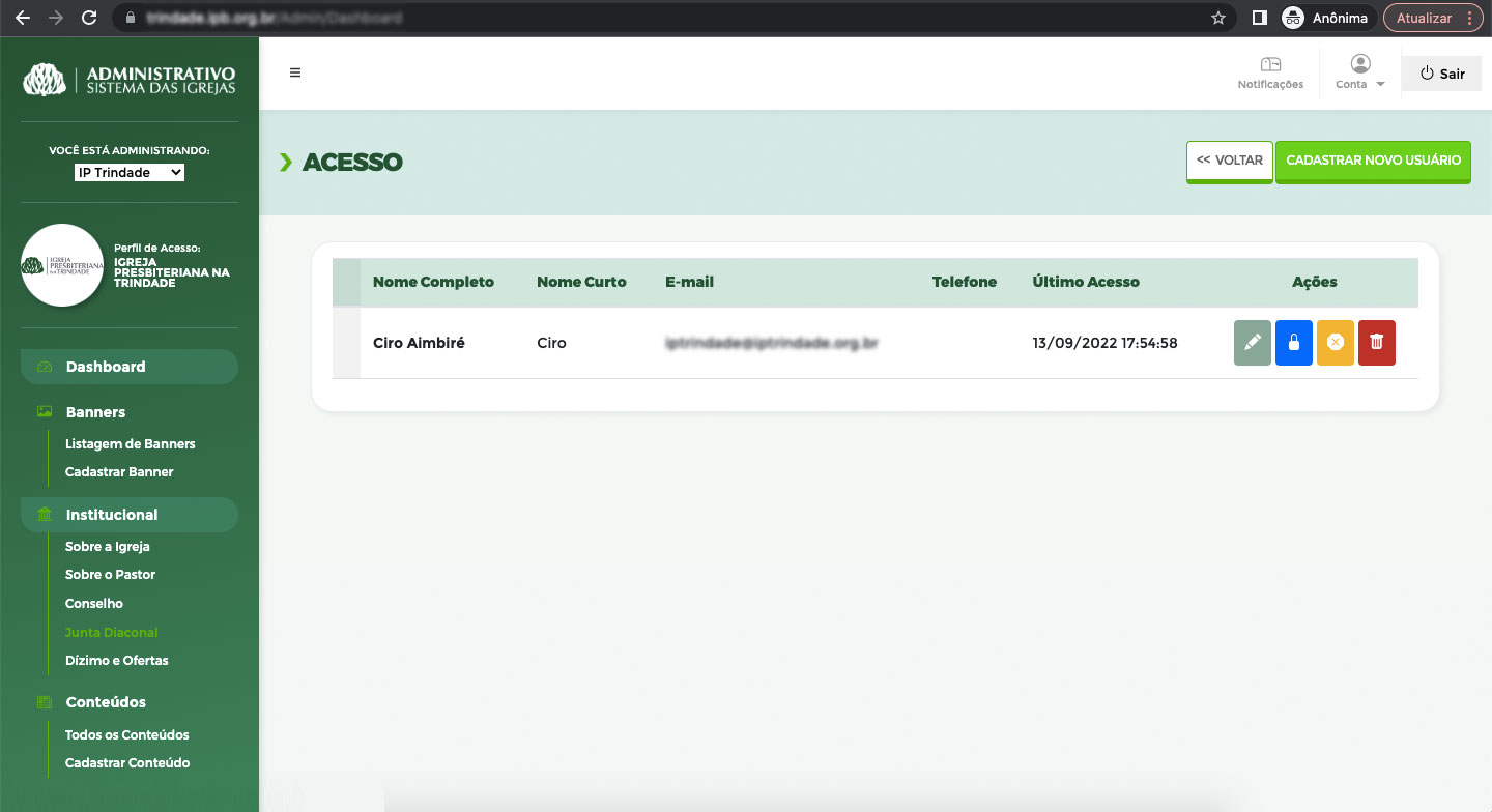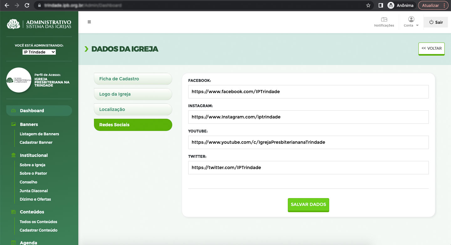 Também em fácil acesso um link para dados da igreja e um botão para alterar senha.
