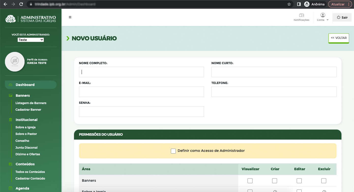 Controle de acesso de pessoas da igreja que vão atuar no sistema administrativo dos conteúdos