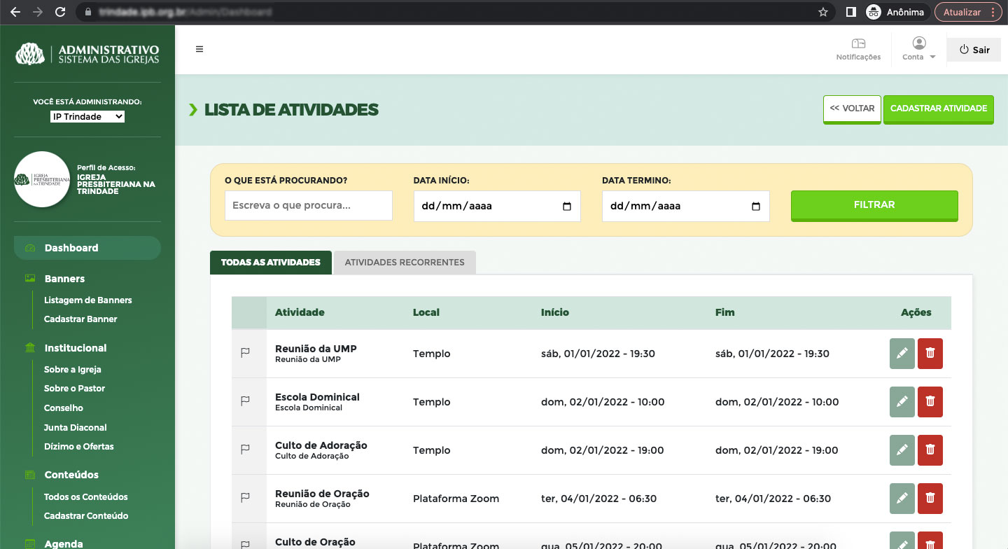 Na página agenda o usuário administrador terá acesso a uma lista de atividades que poderão ser cadastradas, editadas ou excluídas.