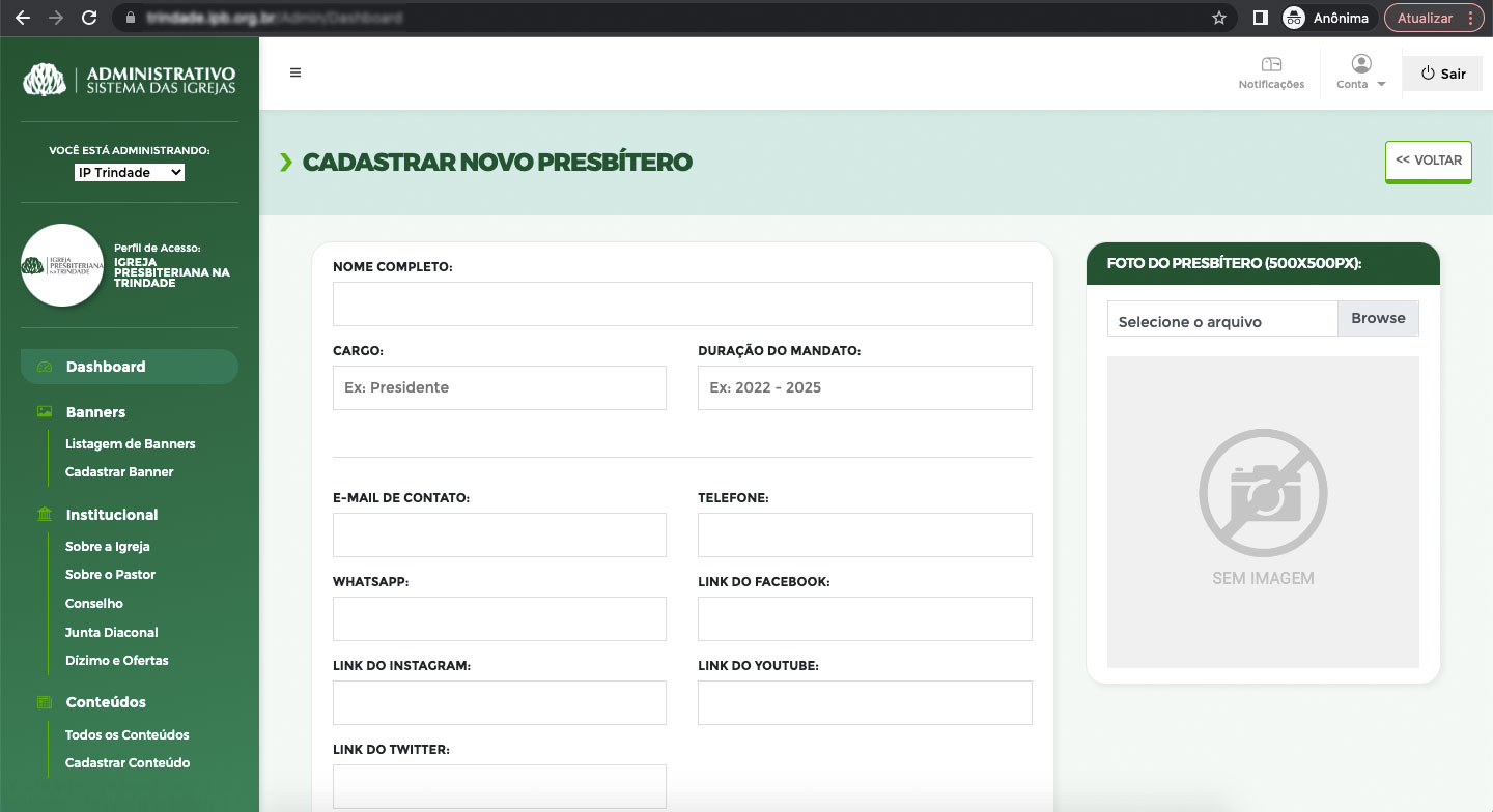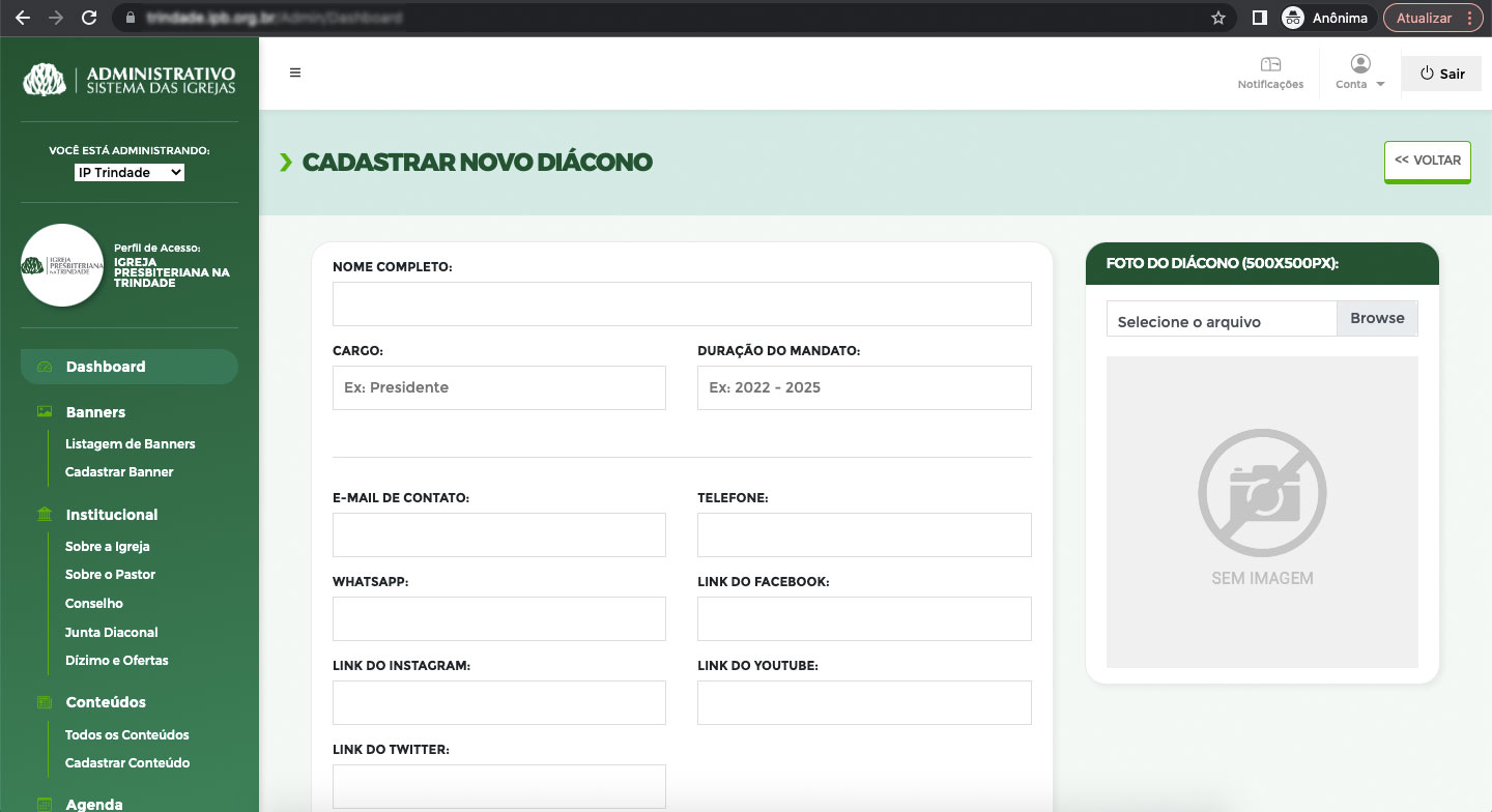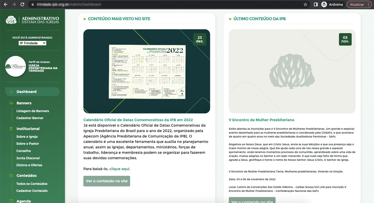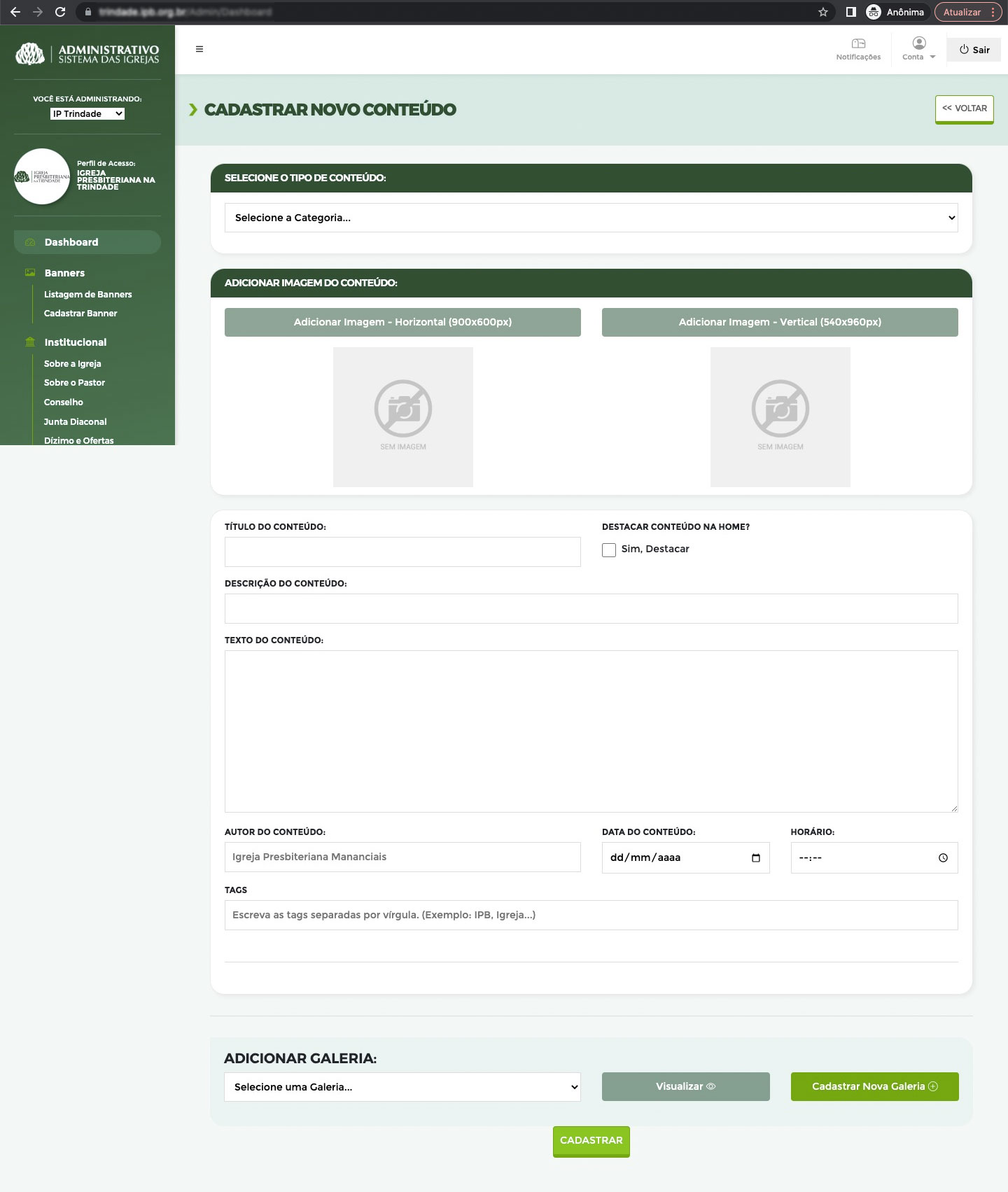 O primeiro passo a ser feito é completar o cadastro da igreja no sistema e iniciar a inclusão de conteúdos como: informações institucionais, história da igreja, quadro de pessoas do conselho e junta diaconal, cadastro de notícias e muito mais.
