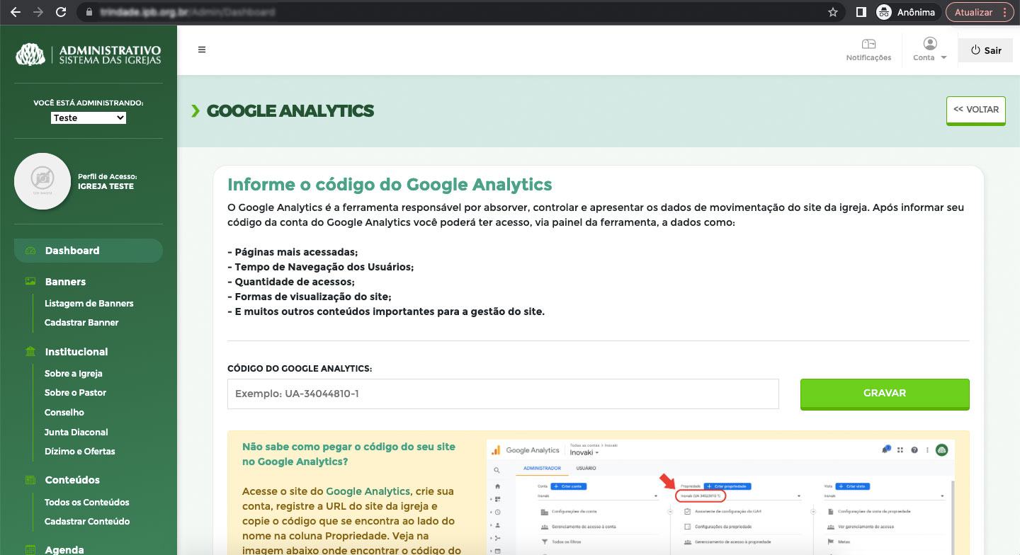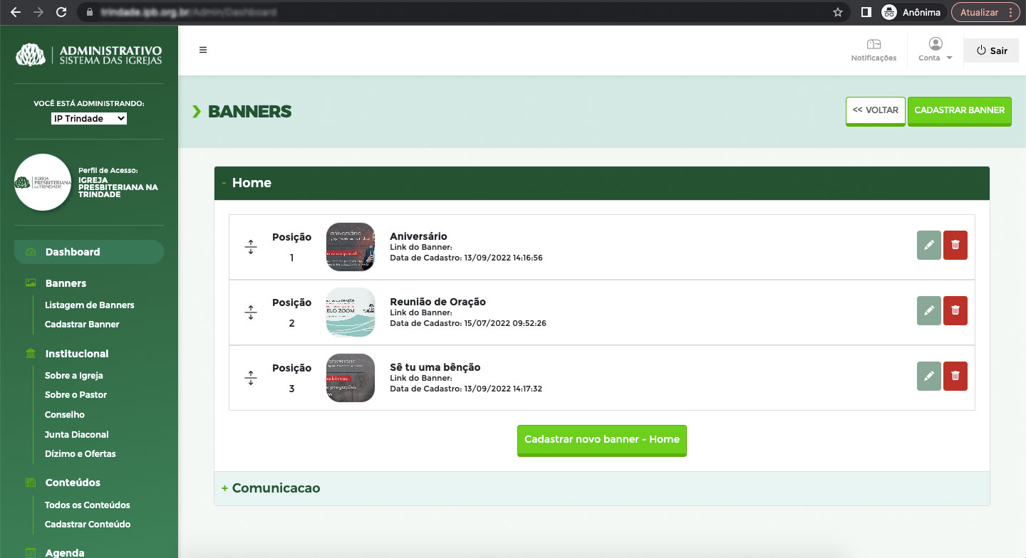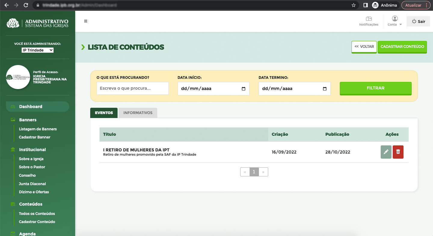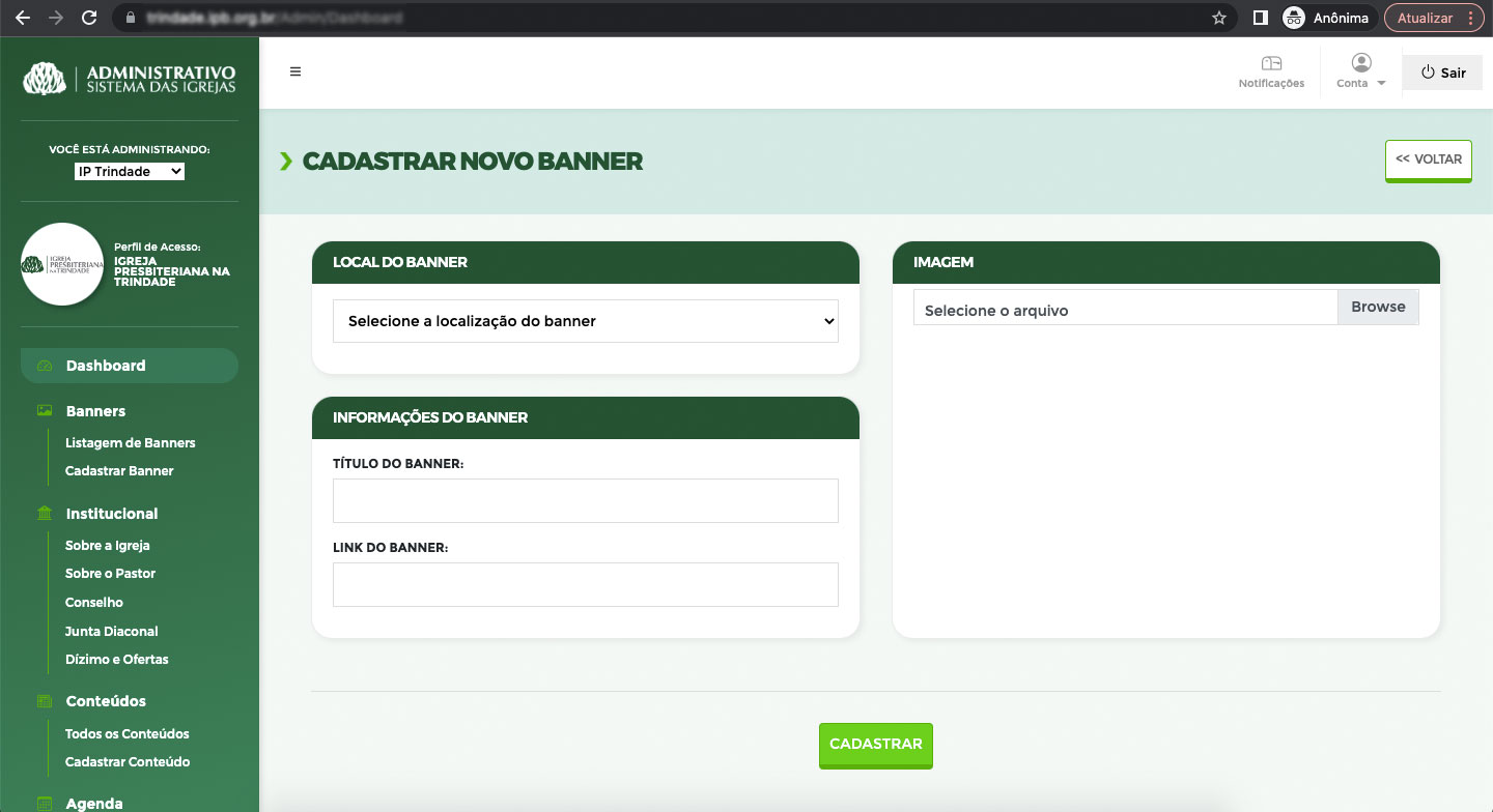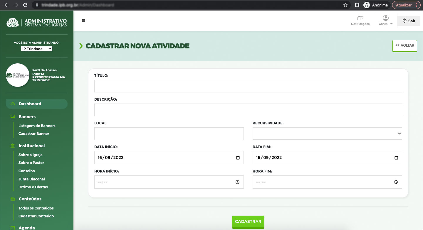 O primeiro passo a ser feito é completar o cadastro da igreja no sistema e iniciar a inclusão de conteúdos como: informações institucionais, história da igreja, quadro de pessoas do conselho e junta diaconal, cadastro de notícias e muito mais.
