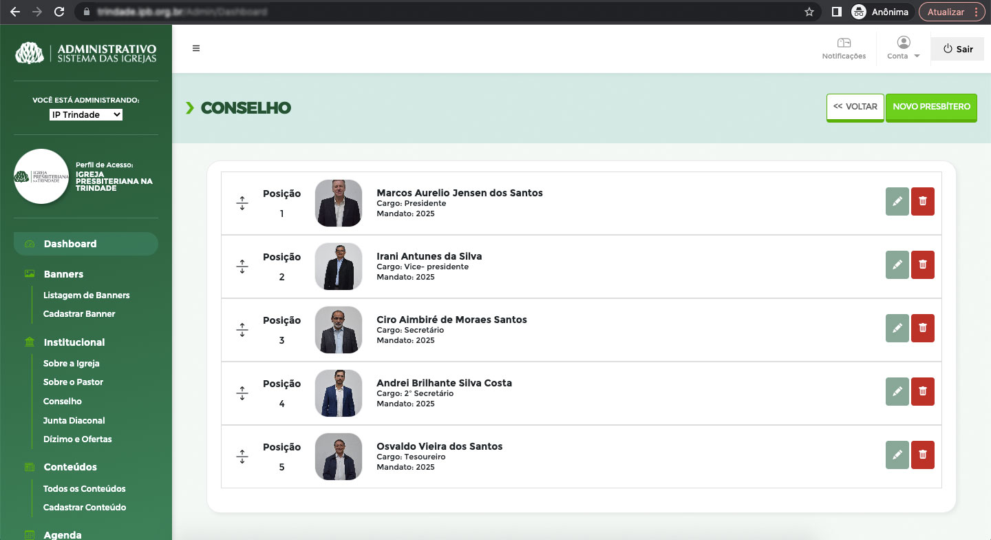 Nesta página o usuário poderá cadastrar membros do conselho da igreja, quantos forem necessários. É possível ainda editar, excluir e alterar a posição dos membros.
