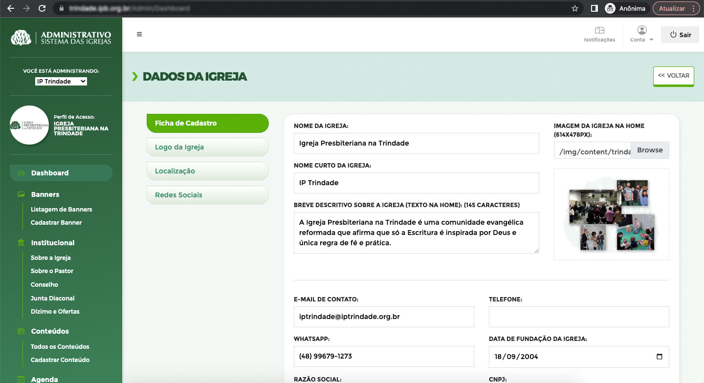 A ficha de cadastro da igreja contém informações básicas da igreja que serão apresentadas em diversas páginas do site e que servirão para identificar a mesma dentro da plataforma da IPB. Os dados administrados por essa área são:
