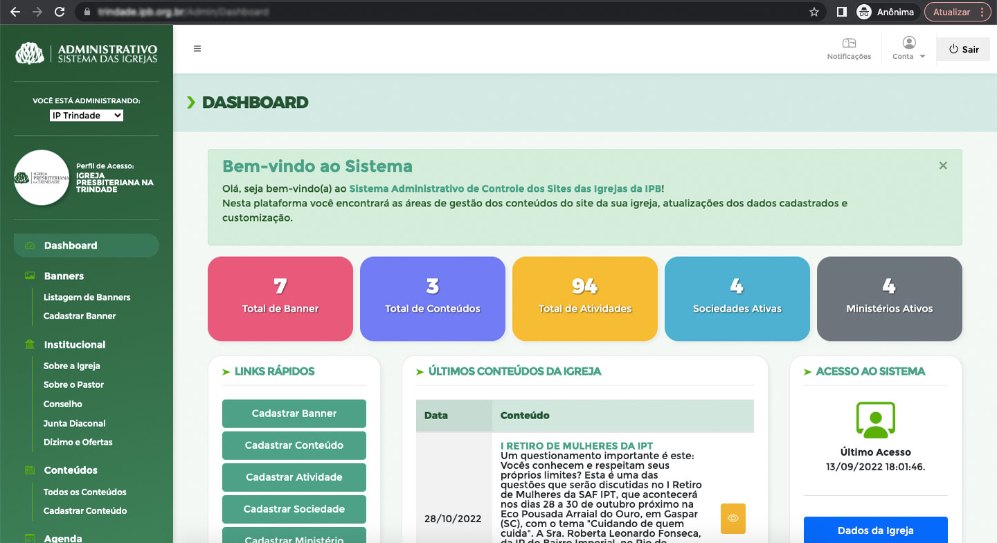O ambiente administrativo de da IPB Sites é um espaço gerencial completo onde o responsável pelo site de cada igreja poderá cadastrar as informações relevantes de sua igreja para sua comunidade.