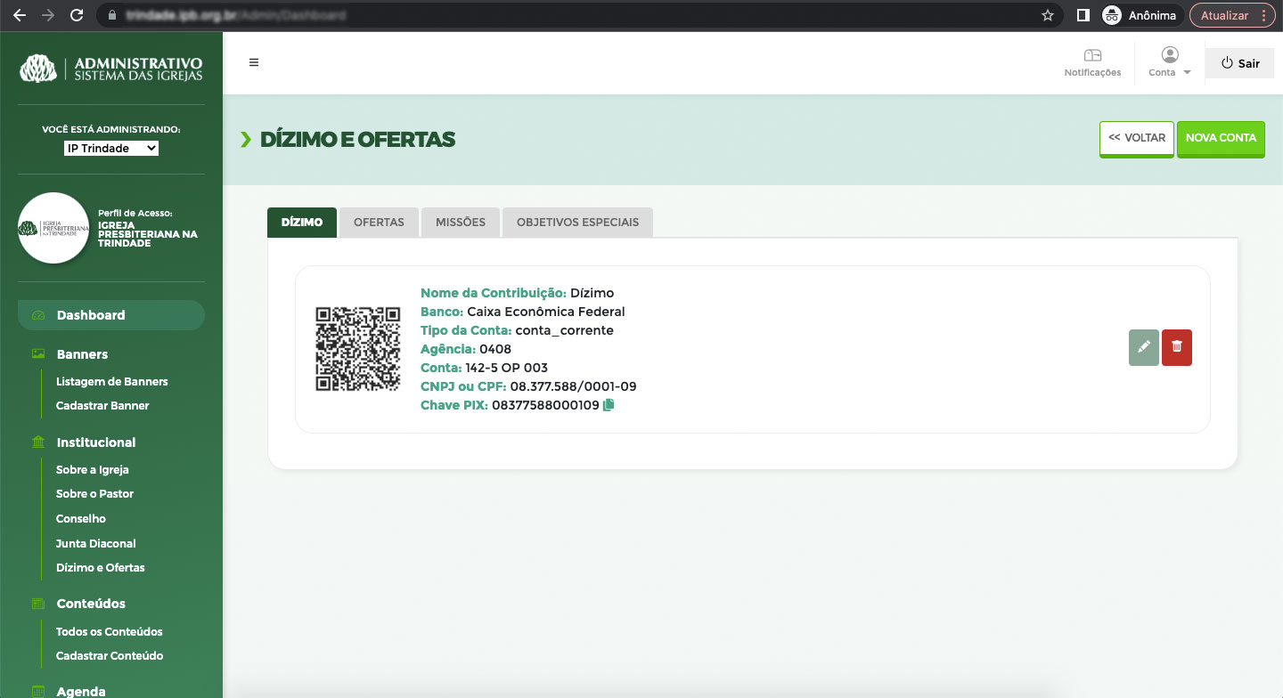 Nesta área de cadastro o usuário gerenciador poderá cadastrar contas para dízimos, ofertas, missões e até objetivos especiais, podendo ainda, editar e excluir.