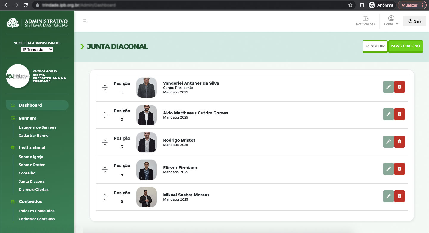 Nesta página o usuário poderá cadastrar os diáconos da igreja, quantos forem necessários. É possível ainda editar, excluir e alterar a posição dos membros.