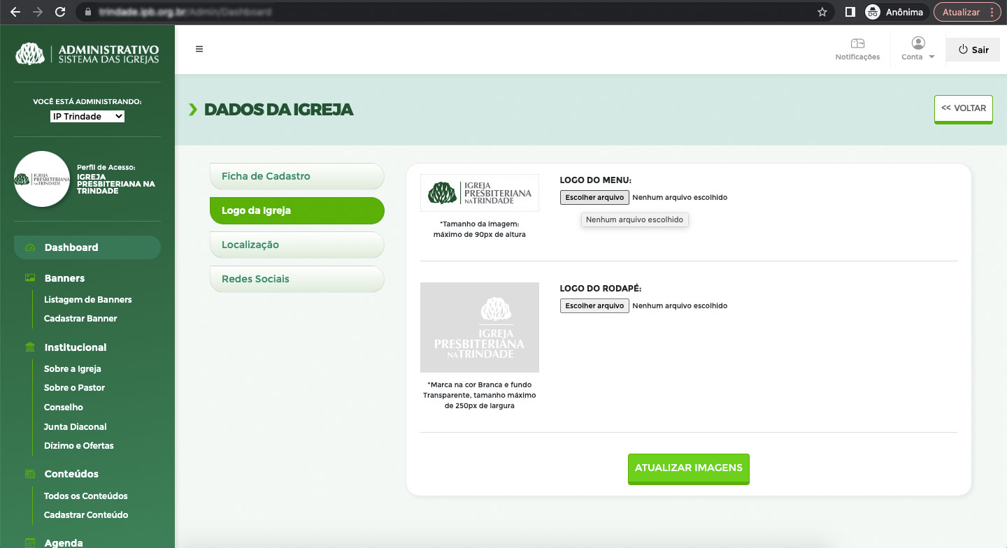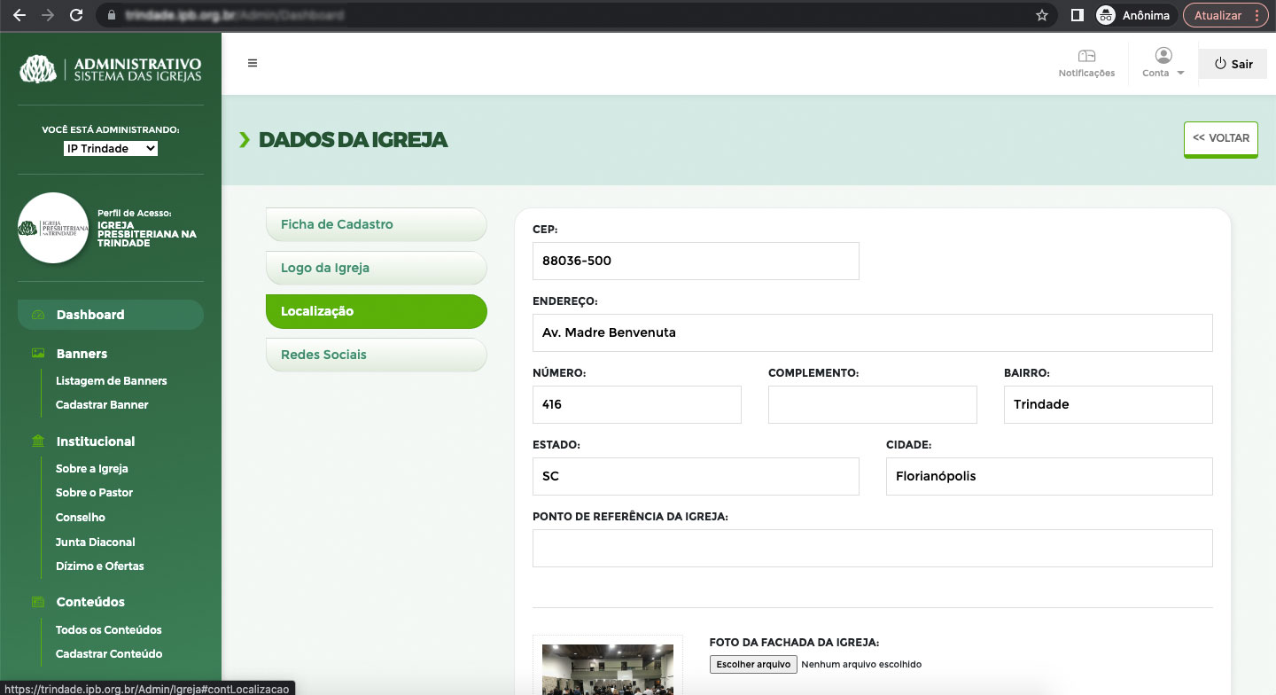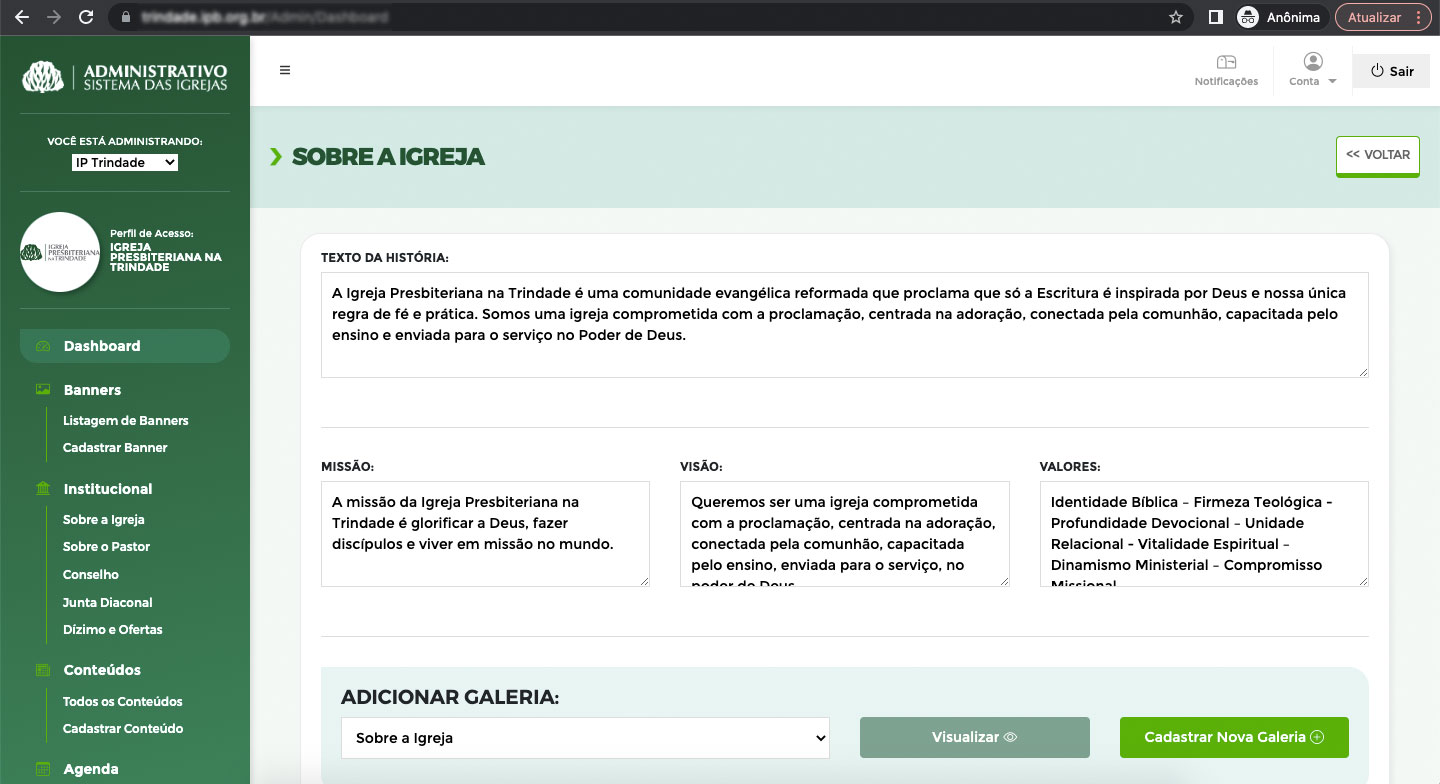 A área institucional é utilizada para mantermos sempre atualizadas as informações sobre a igreja. Neste local você poderá atualizar informações: