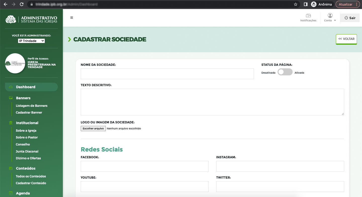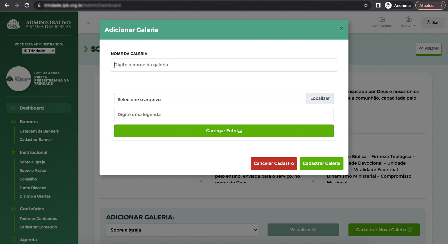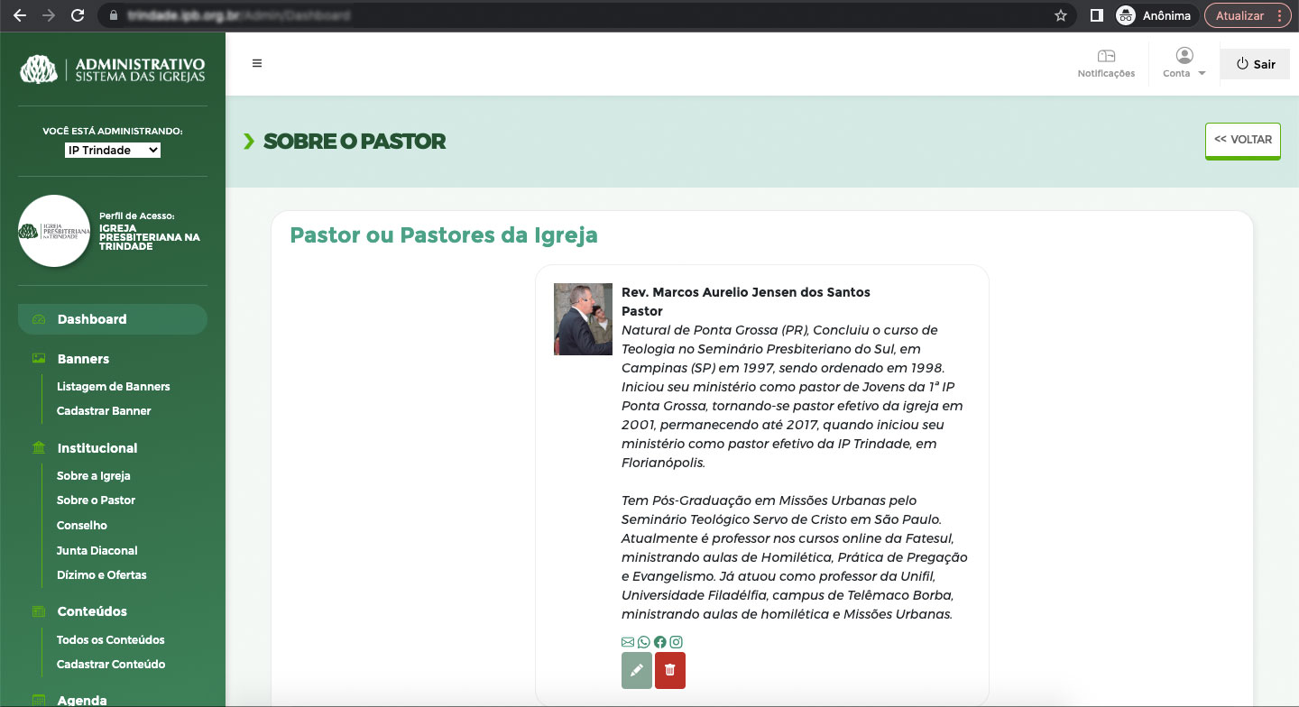A área institucional é utilizada para mantermos sempre atualizadas as informações sobre a igreja. Neste local você poderá atualizar informações: