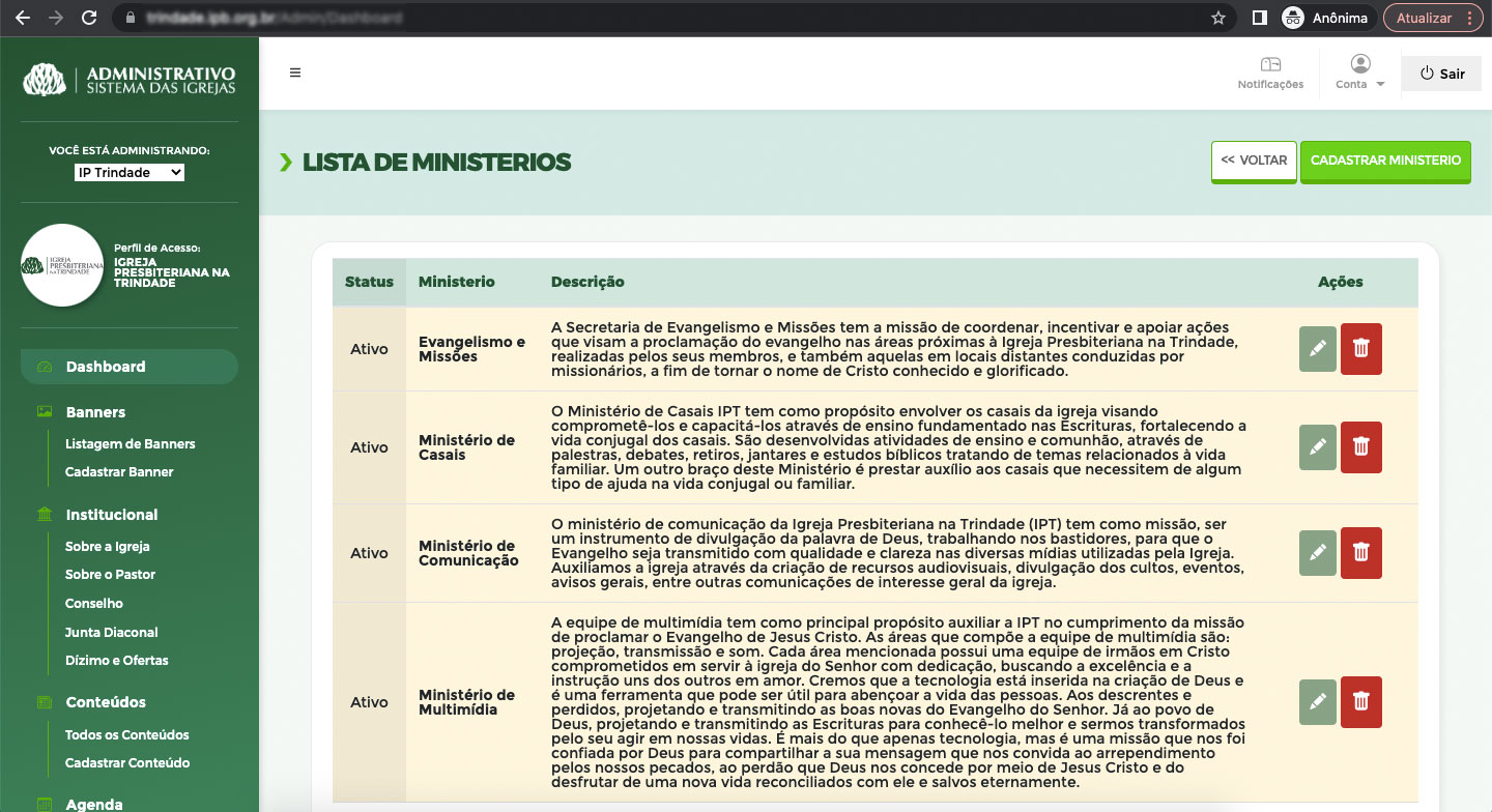 Na página de lista é possível editar e excluir qualquer ministério já cadastrado.