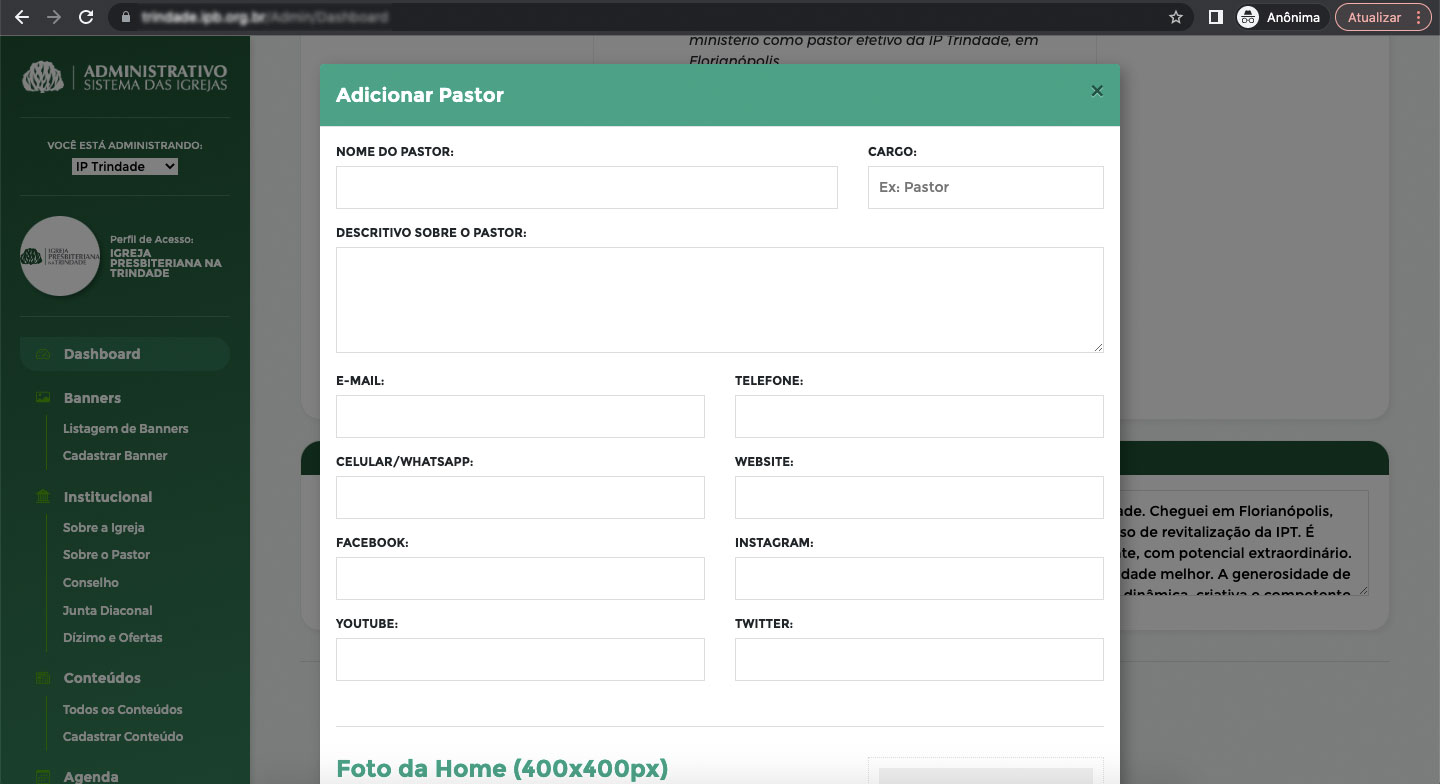 A área sobre o pastor será utilizada para atualizar e/ou cadastrar informação de seu pastor.