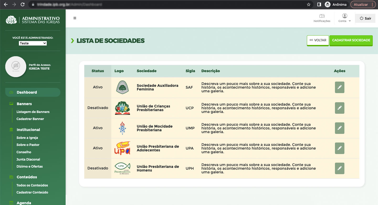 A página sociedades é onde o usuário administrador poderá cadastrar as diversas sociedades ativas de sua igreja, podendo ainda editar e/ou excluir esses dados.