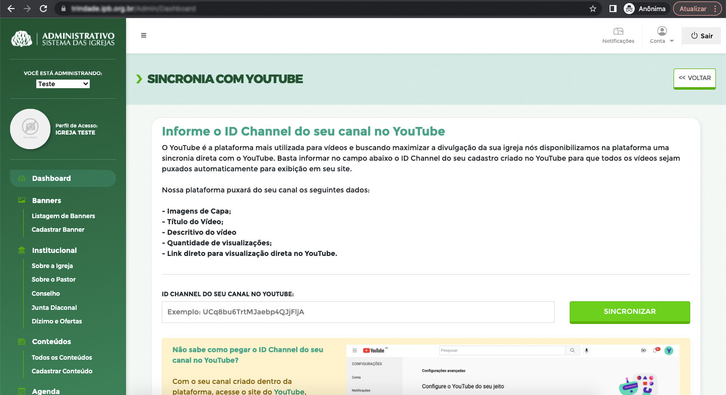 Buscando facilitar para as igrejas o cadastramento de vídeos na plataforma e inclusão de transmissão ao vivo, o sistema permite que o Canal do YouTube da igreja seja sincronizado de forma simples e rápida. Na página de Sincronizar YouTube o administrador encontra uma explicação rápida dos dados que serão puxados pela plataforma de seu canal e um campo para preenchimento do ID Channel do canal.