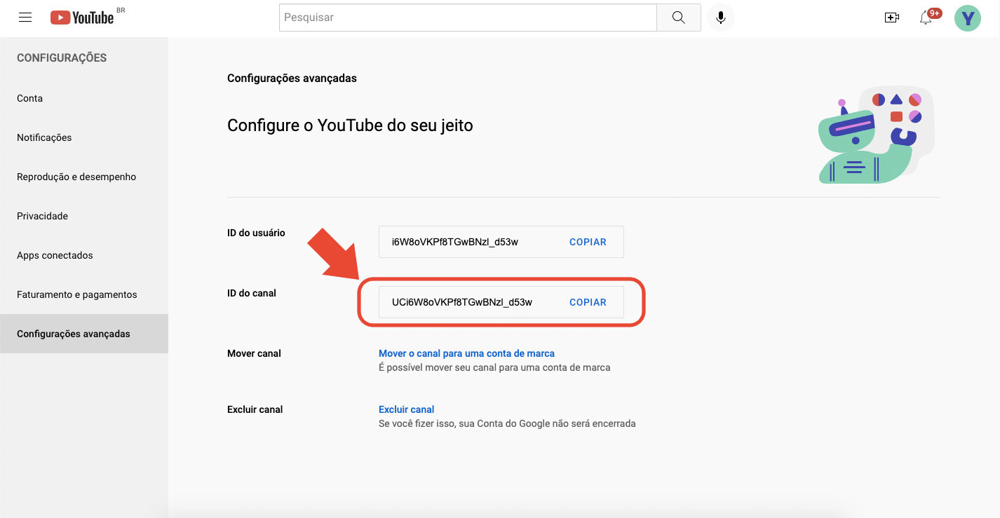 Após acessar a página de Configurações Avançadas copie o código que aparecerá no campo "ID DO CANAL" e cole aqui no campo existente nesta página da Sincronia com o YouTube.